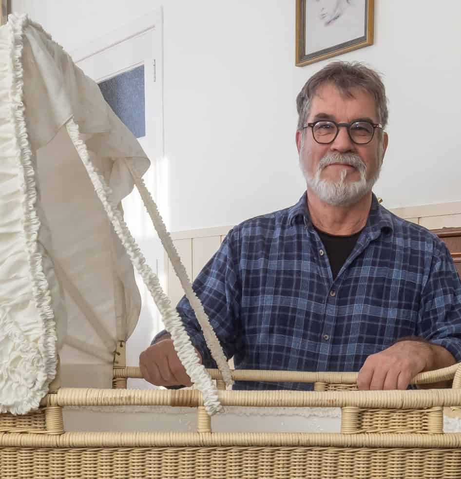 Op de foto bovenaan de pagina legt vlechter Evert Jubbega de laatste hand aan de wieg, voordat die naar de spuiter en de stoffeerster gaat.